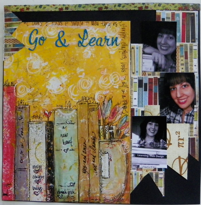 This layout is from 2012…before I entered college again to get my second degree. That was an important time in my life. The yellow page with the books on it was a page I snagged out of a Somerset Studio magazine. It was too pretty not to live on, on a page!