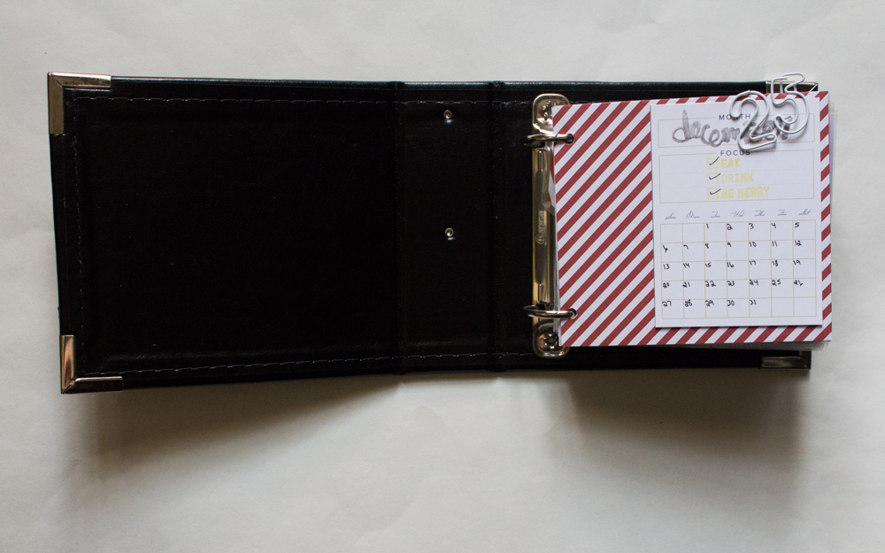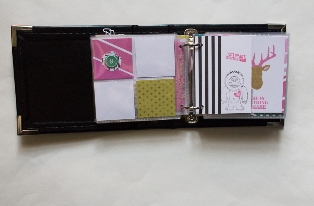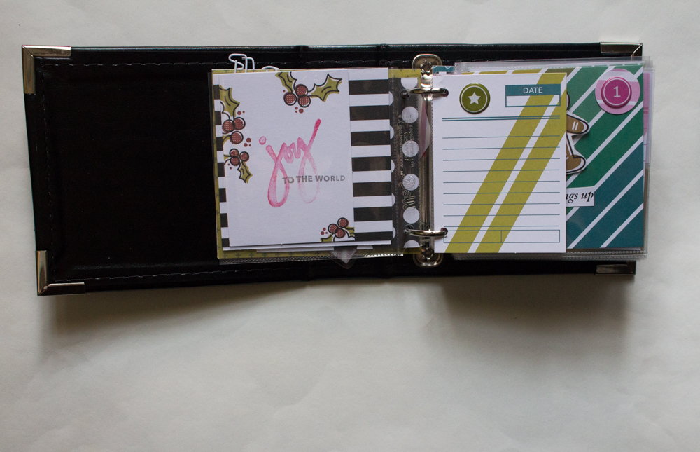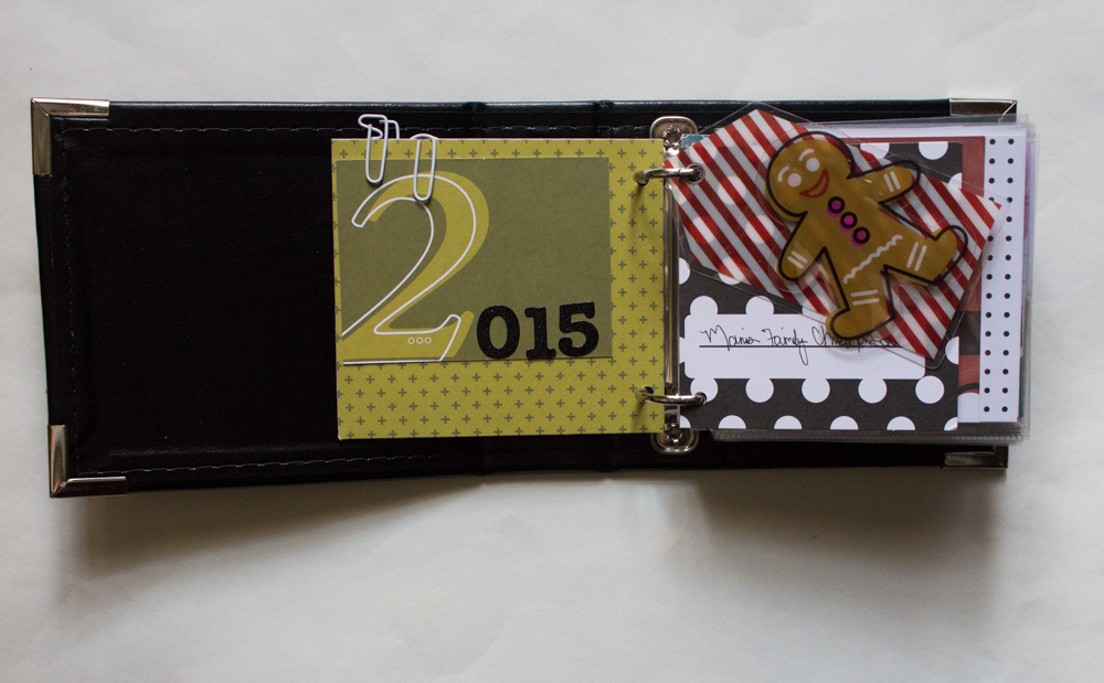 On Thanksgiving, I spent a couple wonderful hours putting together my December Daily album. I bought the Kelly Purkey mini December Daily kit back in September, so I knew I wanted to use that (and some of her holiday stamps too!) on my pages. But what album should I use? I debated whether or not I should use a 6X12 or a 9X12, or just make a 4X6 handmade version. But, in the end, I used one of my WRMK mini albums with 4X4 pages. I found the darling reindeer at Hallmark in their gift wrap department (a set of 4). I placed the black deer on the cover with the year and some washi tape as well. I think the cover looks a lot more traditional than the pages inside, but I’m ok with it now. It’s like when you open it up, it’s a fun Christmas surprise! 🙂 I love how easily it came together. So now all I have to do is place a couple pictures in each sleeve, and it’s done! I’ve never really put together my whole DD album beforehand, but I think by using the kit, it was easier to have it ready.