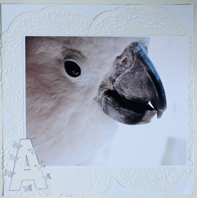 Let me tell you about my layout: I made a monochromatic page, featuring my baby girl, Miss Athena. I don’t use large photos (here, an 8 X 10) very often, but I love the bold effect it gives! It makes you focus on the photo. I used doilies on my layout to represent the circles. And I love the large letter A for my title.