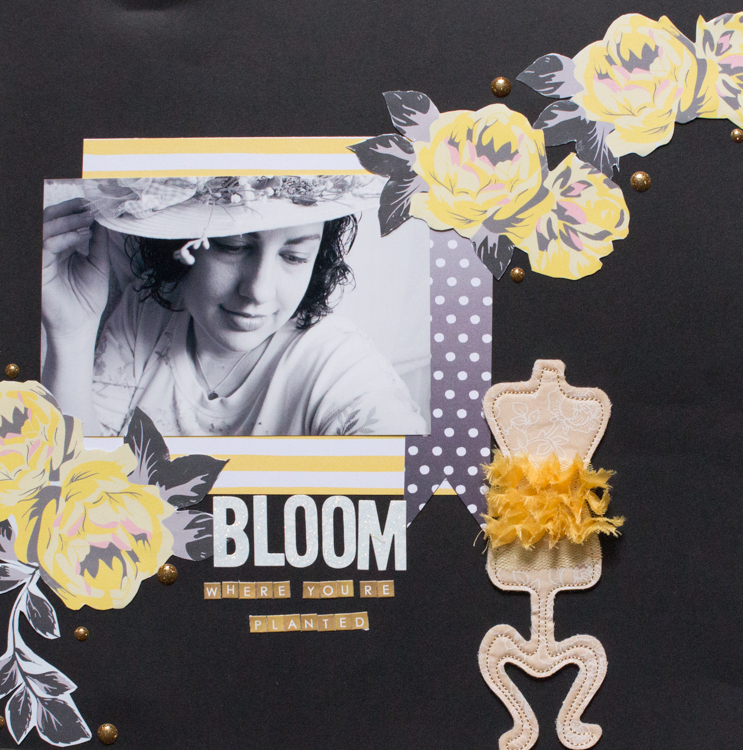 This one was one of my favorites. I bought some Felicity Jane papers recently because they are all so beautiful! I fussy cut the floral paper for this layout. The layout needed another embellishment, so I went into my stash and I found this fabric dress form from Prima…circa 2009 I think. I had bought two of them back in the day, and only ever used one. I decided this layout needed it, so here it is!