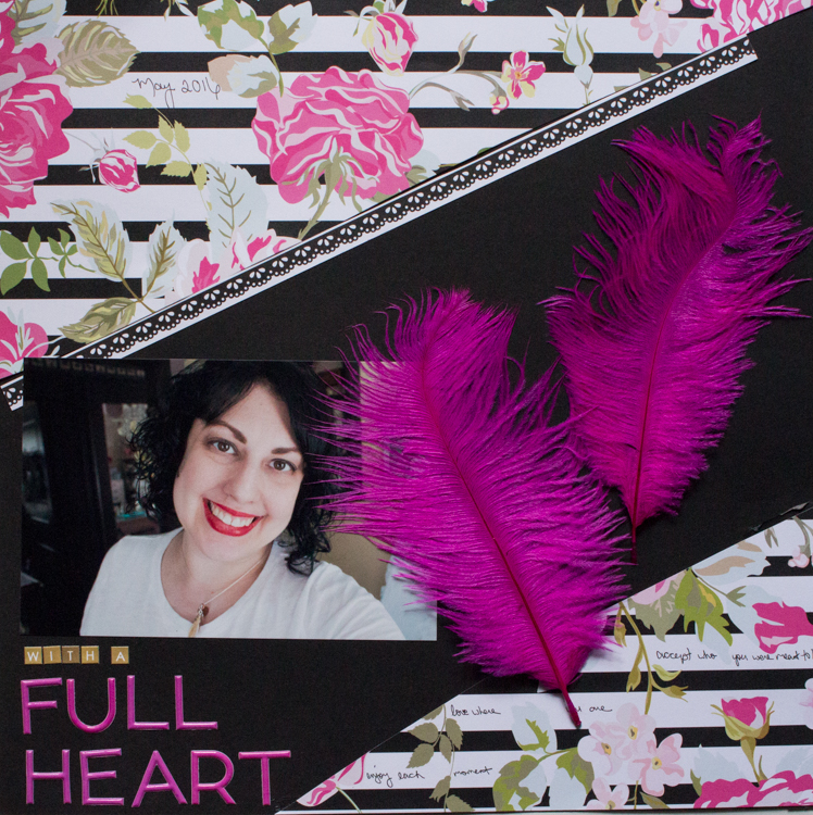 Today I wanted to share a new layout I made over the weekend. You know how easy it is to hoard your favorite papers for… forever? I looove this floral paper from Felicity Jane’s January kit! But, what good is it sitting there all pretty on my paper rack? It needs to be on a layout helping to tell my story! So, I cut it up (I still have a piece, sitting on my paper rack, lol), and made a page. I have a thing for black and white with florals. I love the contrast. And, I had these feathers I bought at last year’s Scrapbook Expo taking up space in my drawer, so on the page they went too. Now, that feels good to use some supplies!
