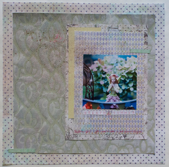 I wanted to share a summery layout today. It’s almost a #tbt layout, as it’s been sitting in my blog queue since last fall. Oops!! But, I thought I would share it with you today, to help celebrate summer’s arrival. 🙂 I love this photo with this little fairy. It reminds me of the lightness of summer. The breath of summer is precious, because it is so temporary.