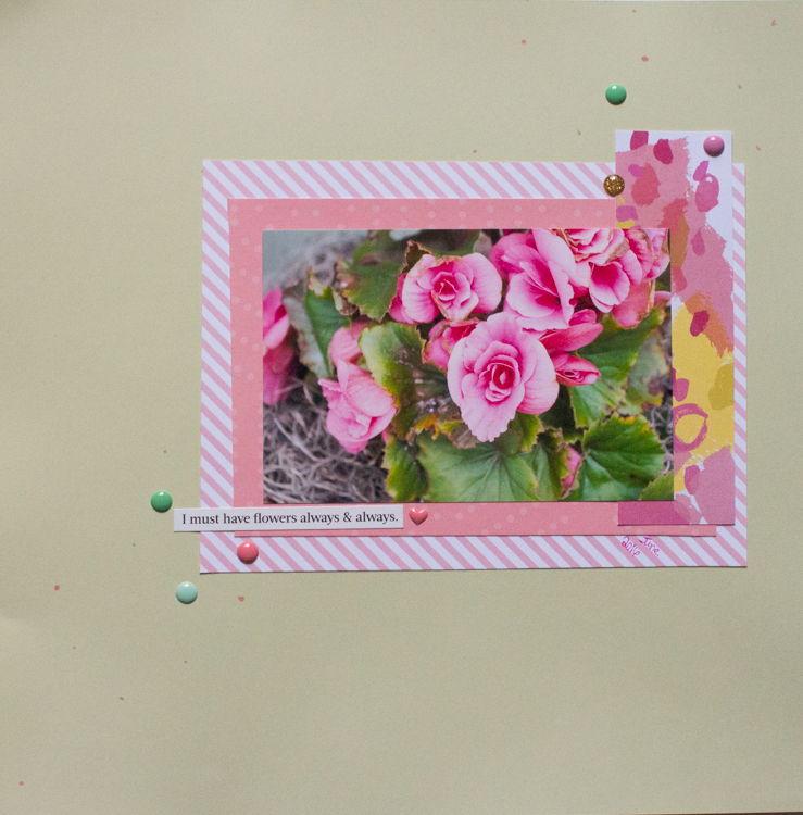 I wanted to share a new layout today of one of our beauties in the backyard. I really wanted this photo to pop and have center stage, so I kept it simple with just a few patterned papers and enamel dots highlighting my pretty flowers. I always start my pages with papers, and then sometimes I feel stuck, like I need to add $10 worth of embellishments to the page to properly “finish” it. I don’t always need to do that, no one does really. 🙂 If your photo is strong enough, just let it be.