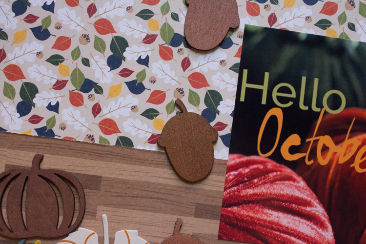 Hello there! Well, now that it’s November, I thought I’d share my Hello, October layout! 🙂 I love this photo, so I had to scrap it! I actually did a series of pumpkin portraits for a large black window frame for my mom, and I loved how all the photos turned out. I didn’t used to like making fall themed layouts, but I have embraced the colors of the season as I’ve gotten older!