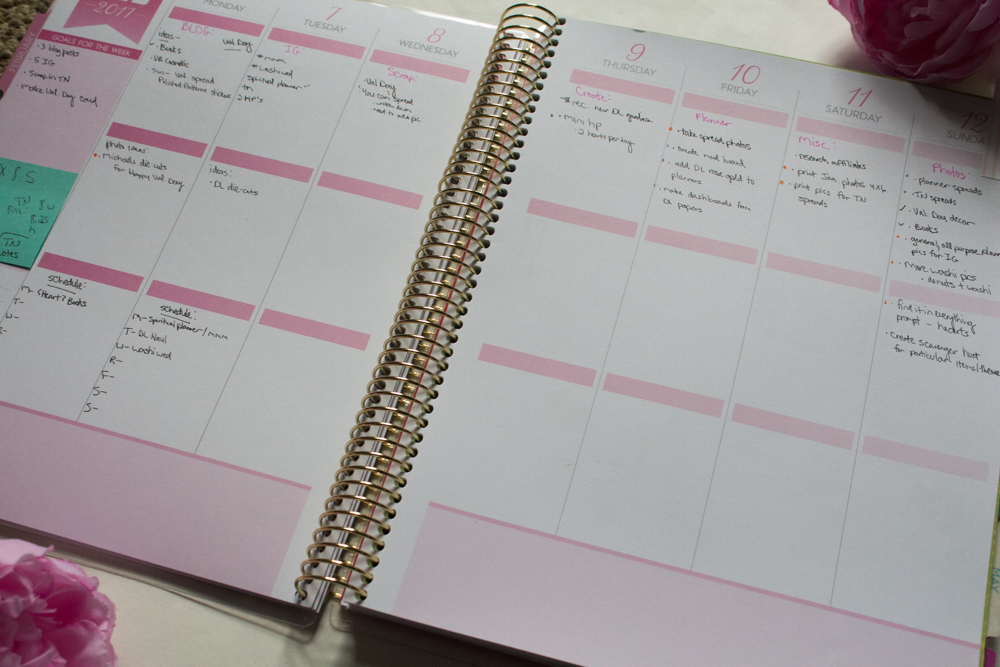 Here is my pretty Recollections planner. It is one of the larger sized ones Michaels carried at the end of last year. I originally wanted to use it as my memory planner, with photos, stickers, and such. But, as I completed the first two weeks of the year, I wasn’t feeling it. So, I turned it into my creative life planner a la Stephanie Howell. I plan and record what I want to complete on my blog, IG, scrapbooking, photography-wise, and miscellaneous creative tasks during the week. Not a lot of decorating going on here, and that may change as I get more comfortable in this planner, but it’s ok with me for now. It’s pretty on its own anyway!
