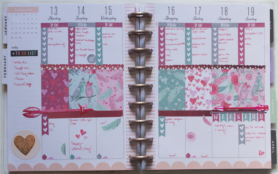 Here is Valentine’s Day week below, and I used a kit I had been hoarding since November from Polished Patterns on Etsy. I love the colors. And, the birds…love!
