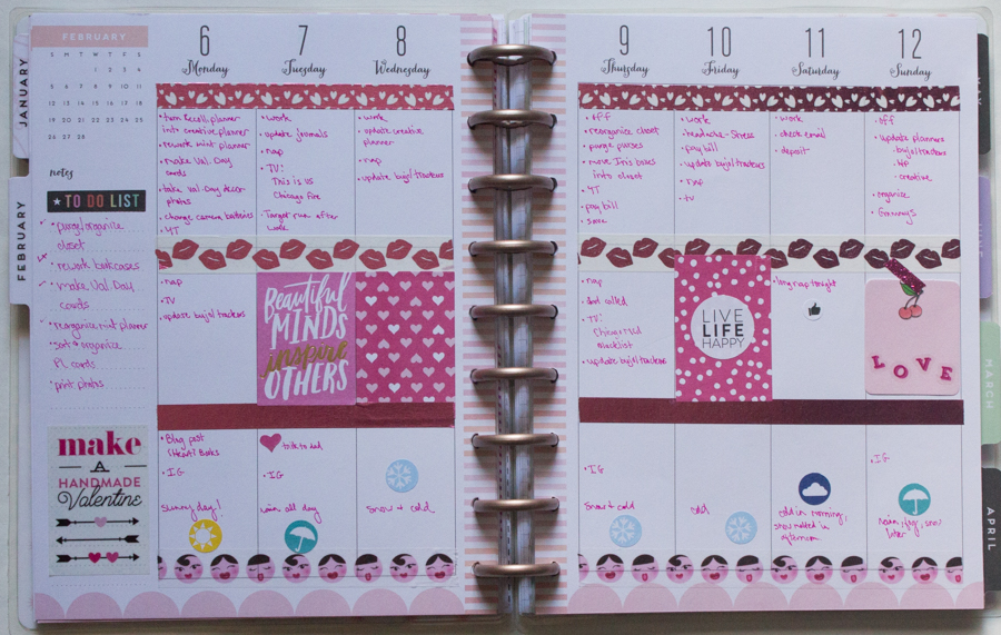Today, I wanted to share a flip-through of February in my Happy Planner. I’m happy to say that I’ve rediscovered my love of this planner. I think the key for me to enjoy this planner is to use it creatively, and to make it pretty with stickers. 🙂