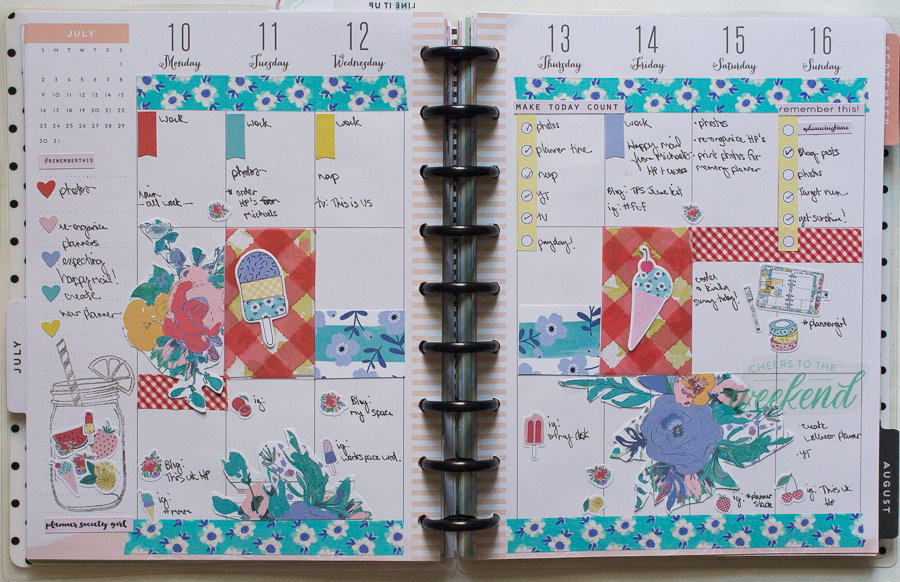 For the second week of July, I wanted to incorporate some of my June Planner Society kit. I fussy cut a couple of florals and used a stamp on this spread. I love the picnic vibes!