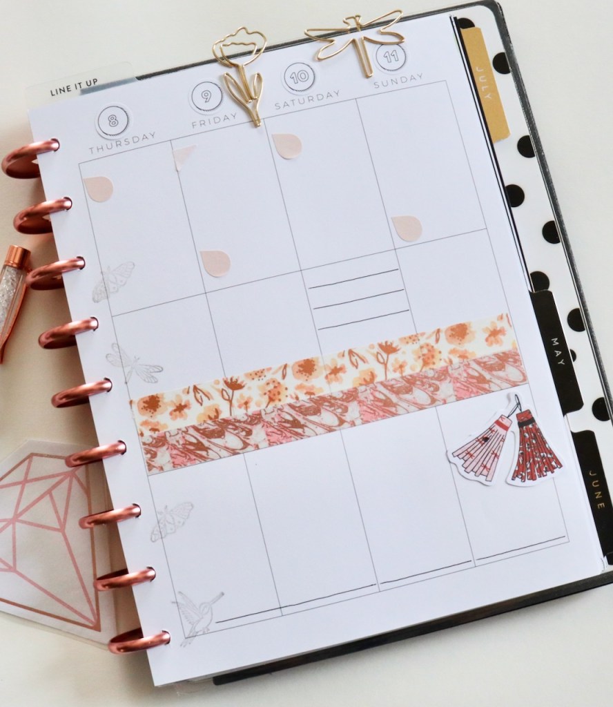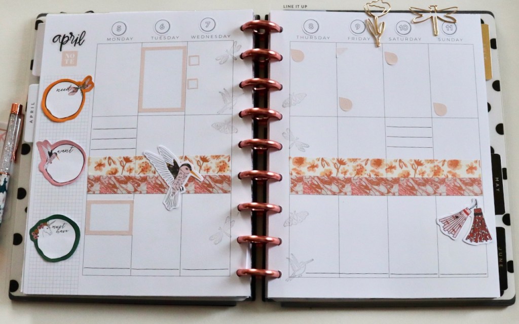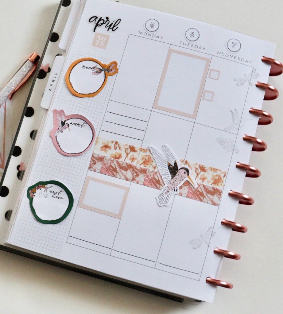 I’m back today with a new weekly spread in my Happy Planner. This week’s spread is a combination of a lot of things 😜 and shops, like sticky notes, stamps, and die cuts from The Planner Society. I also included a little washi from Love, Charmaine. A new addition to my stash is the Functional Pastels sticker book from Fancy Plans. I love this book! 😍 My layout is a little extra, but I think it all works together. If not, it’s only for a week, then I can literally just turn the page!