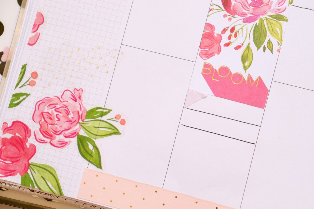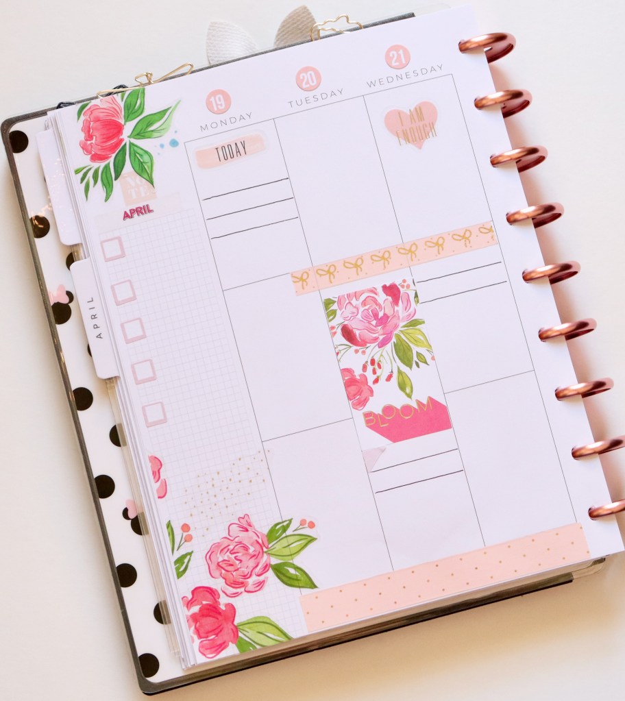 Hello! I’m back with another weekly spread. True to my style, it’s florals again! I seriously love how this spread came together! I love all the shades of pink with a touch of spring green and of course, a little bit of Simply Gilded washi to tie it all together. All stickers are from Happy Planner sticker books, except for the date stickers, which are from Carpe Diem and the boxes, which are by Fancy Plans.