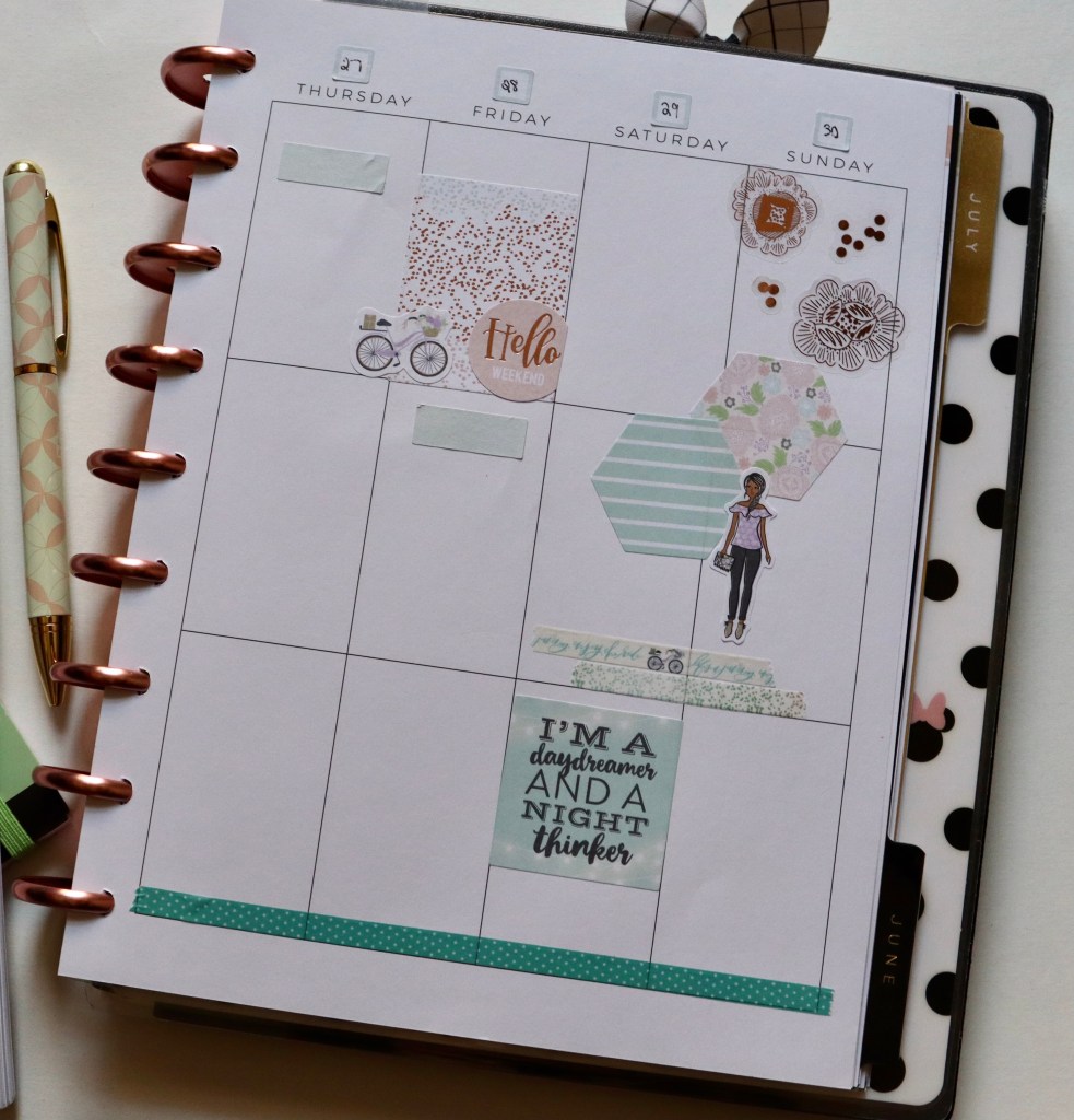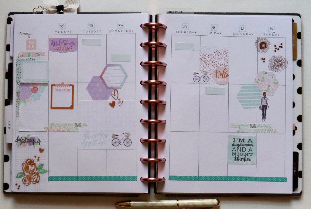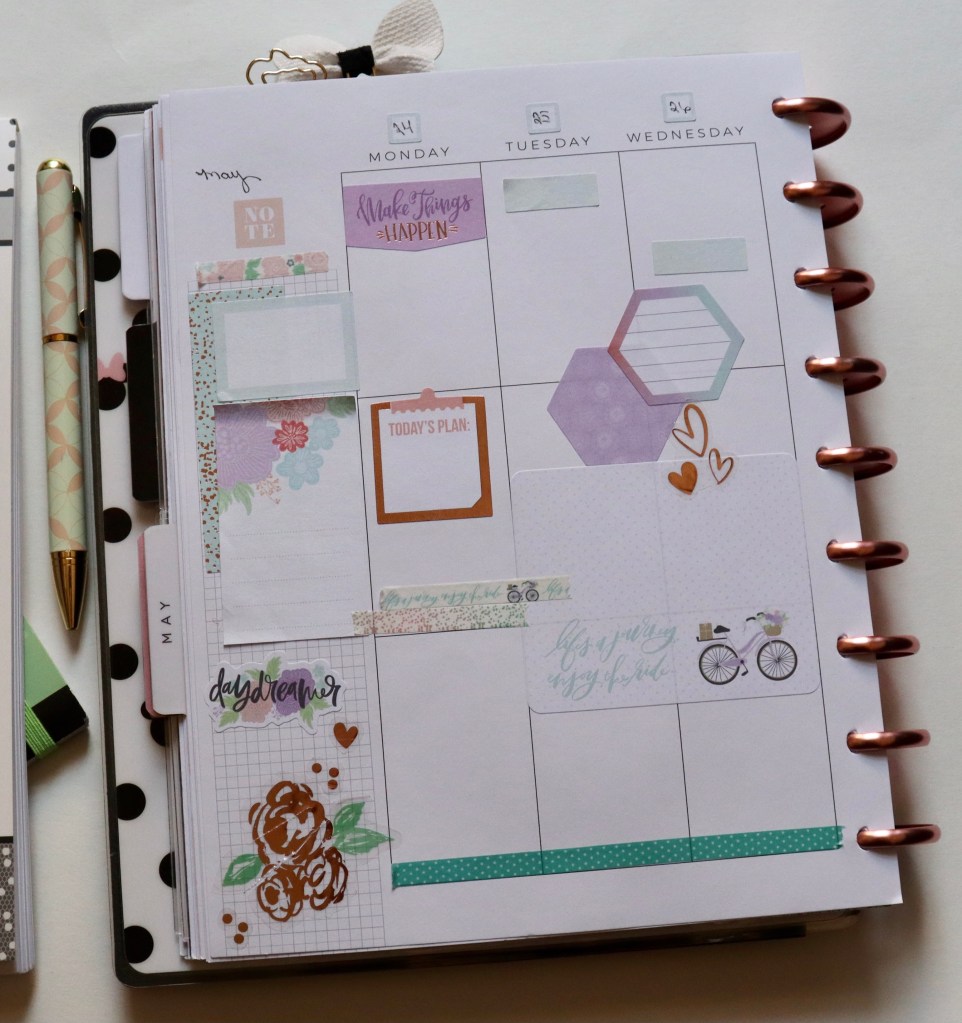Today I am sharing my new weekly spread in my Happy Planner. It’s still technically spring, and I feel like Memorial Day will begin the summer spreads in my planner, so I wanted to celebrate this “last” week of spring with a pastel and light spread. Pastels and rose gold? Yes, always. The majority of the stickers I used are from the Mambi Daydreamer sticker book. I don’t use those nearly enough!
