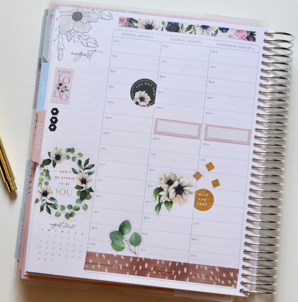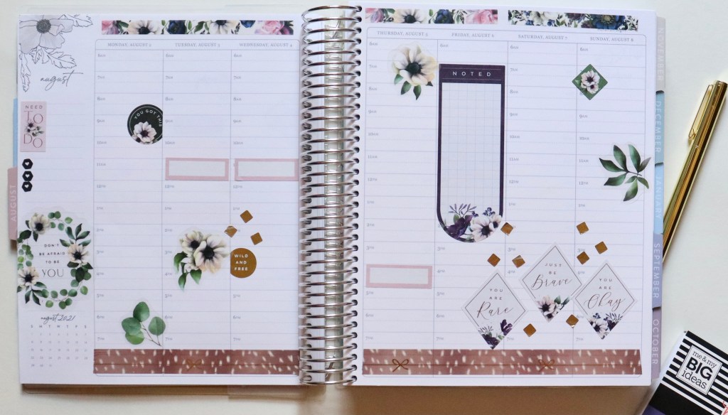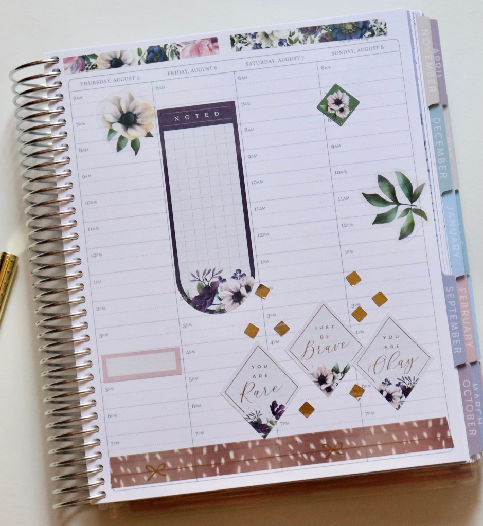 This week I’m using a new sticker book (to me) from The Happy Planner, Beauty in Florals. This sticker book is gorgeous! 🙌🏼 I really feel like it will be perfect for fall, but I couldn’t wait to use it! I used some of the lighter stickers from the book, along with some inspirational quotes. I cannot have too many of those. The washi at the bottom is by Simply Gilded. The pink boxes are from Fancy Plans.