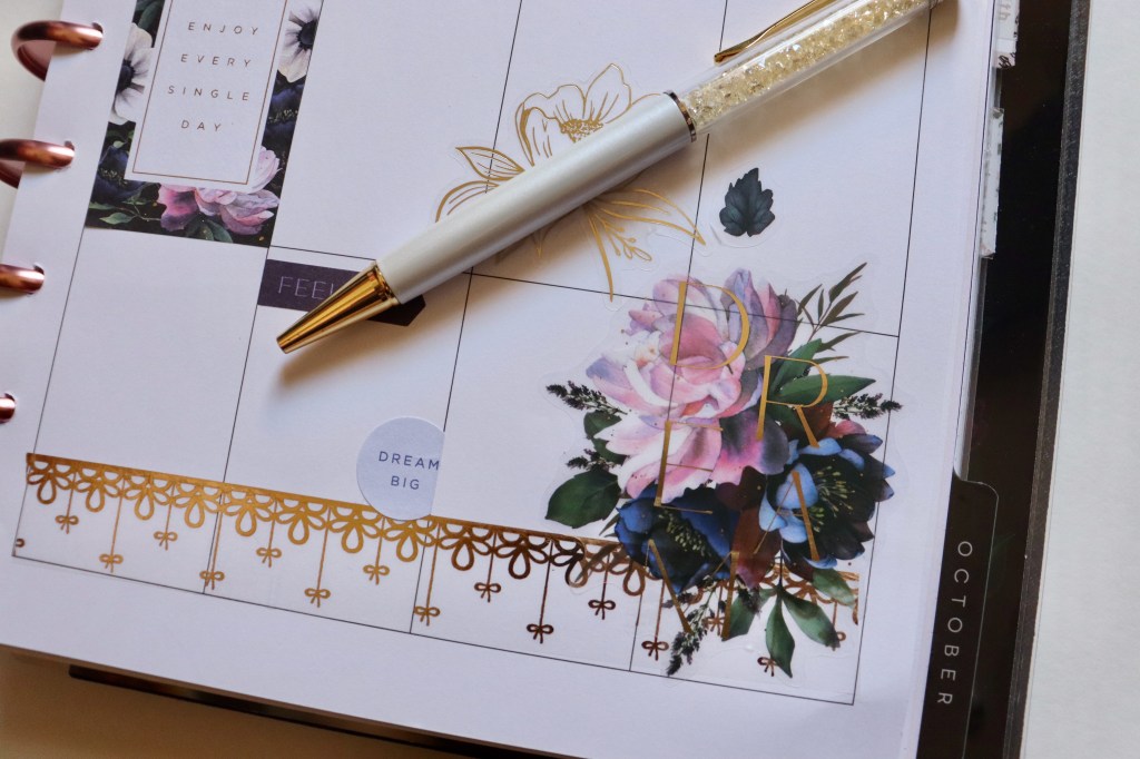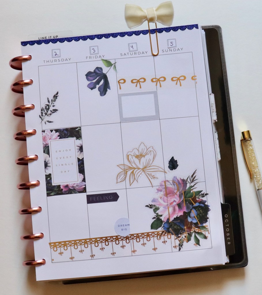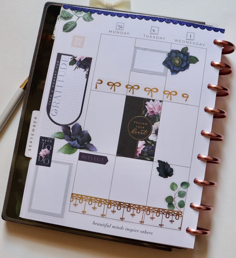 I’m getting ready for fall, so that means that I’m changing planners again. I love my Erin Condren (affiliate link) hourly planner, but I am craving something different. So, the Happy Planner returns! I have an undated HP, so it’ easy to jump right back in. I used the Beauty in Florals sticker book for the majority of this spread. Dark purple and pink florals? Yes please. 💜