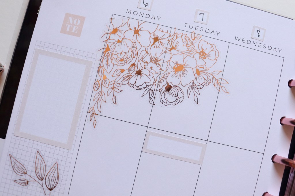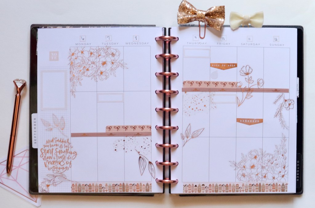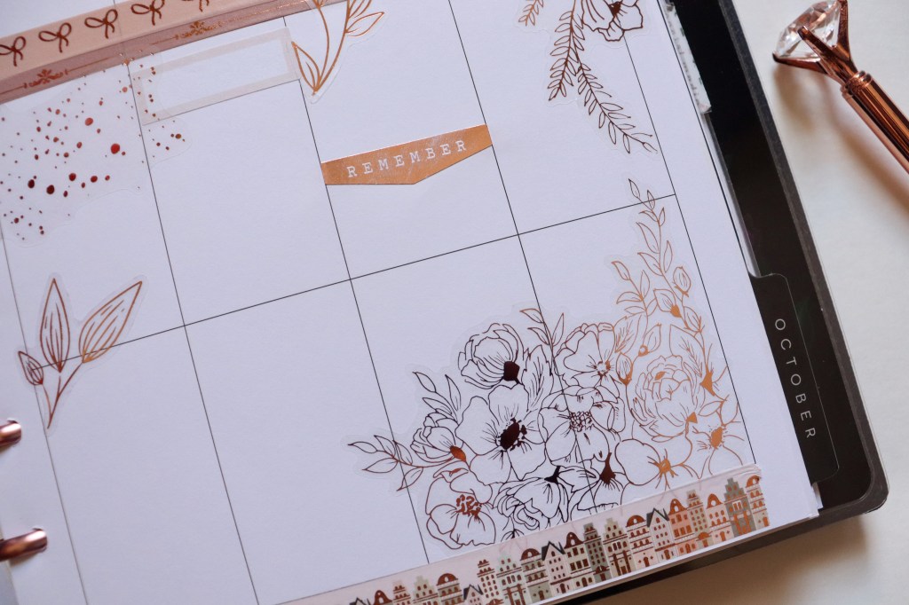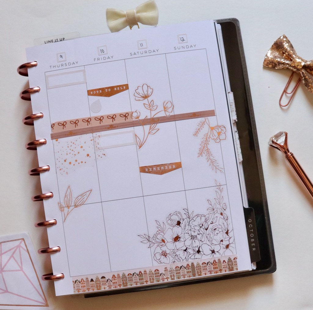 My layout for this week in my Happy Planner is all about rose gold. I still love using all the rose gold in my planner after all these years. I love the tones, especially for going into fall. This spread is a combination of Happy Planner stickers, Fancy Plans box stickers, and Simply Gilded washi. I love how this spread turned out, and I can’t wait to use it this week!