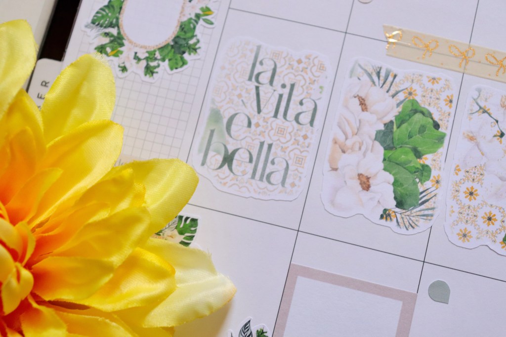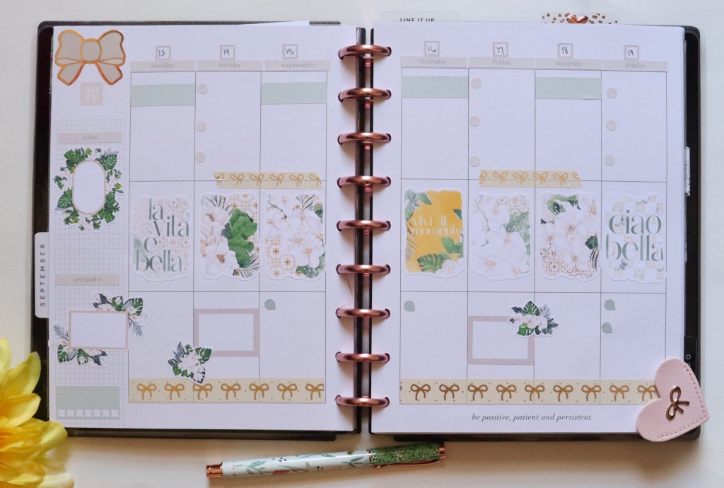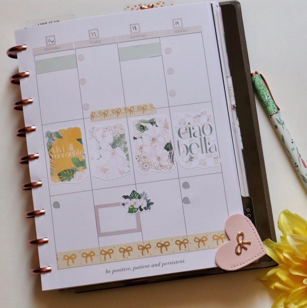 I love how this week’s spread turned out!! I used a sticker kit from Love, Charmaine. I thought this sticker kit would look great to celebrate the last (official) week of summer. It’s bright and cheerful, and kind of neutral at the same time. The bow sticker and all washi are by Simply Gilded. I placed the ‘Ciao Bella’ sticker on Sunday to say goodbye to summertime. 🥲