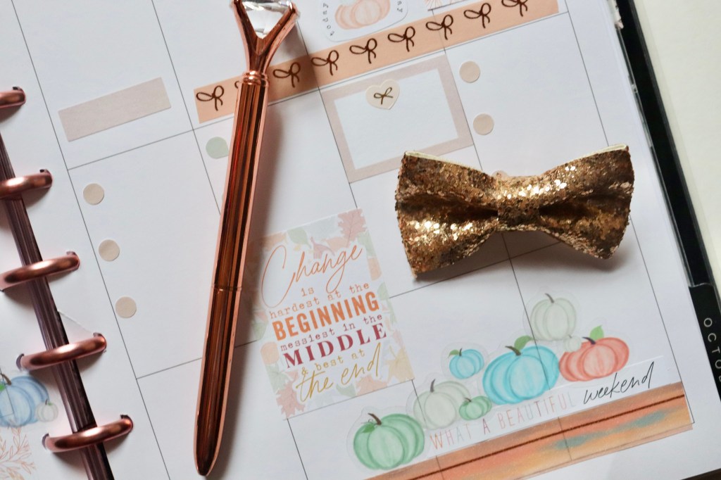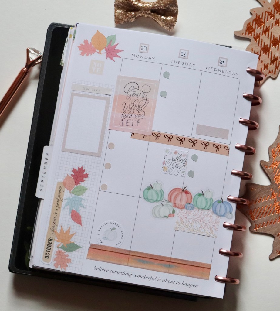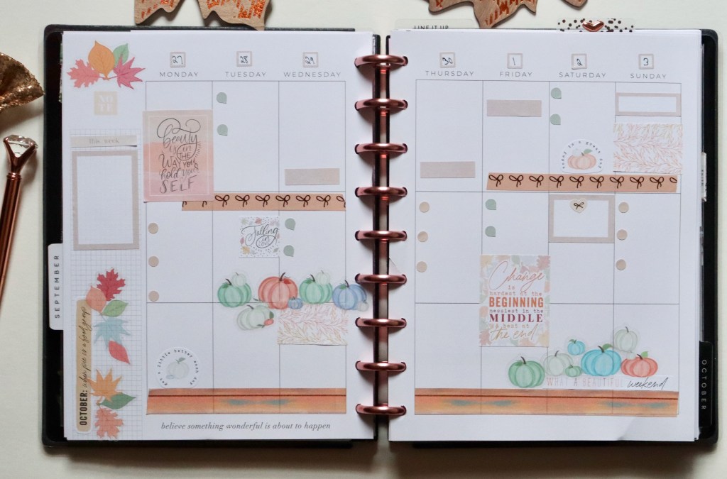 Can you even believe October is almost here?! It’s such a pretty month. So many transitions. Let’s enjoy it! For my spread this week, I used some Happy Planner stickers from my seasonal sticker stash. I love the soft color scheme. The little pumpkin stickers are adorable, no? I used some Simply Gilded washi to set the whole layout off.
