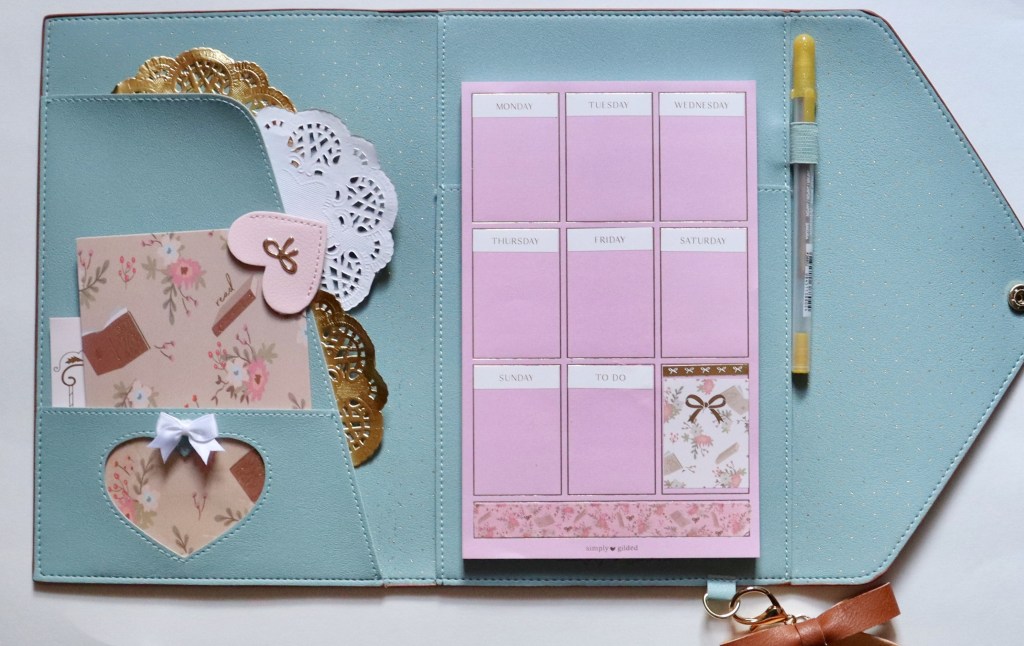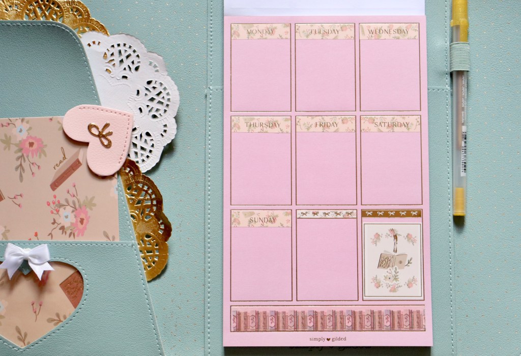 I just wanted to share my padfolio setup from the Free Range box from Simply Gilded. I love the teal interior of the padfolio, but I didn’t love the tan notepad that came with the box, so I purchased this gorgeous pink version. I’m not entirely sure how I want to use this setup weekly, but I know I want to use up some of my Simply Gilded (& others too) sticker and washi collection in a different way. It’s a fun way to inspire myself (and hopefully you too!) by using my collections in a new way.