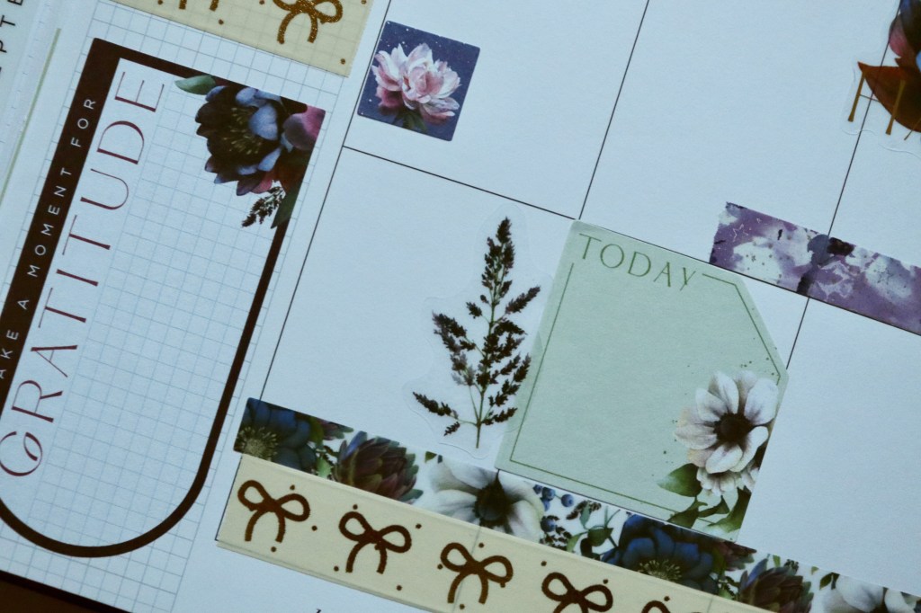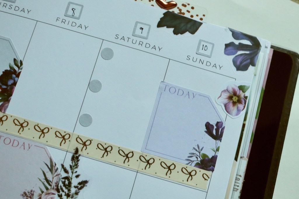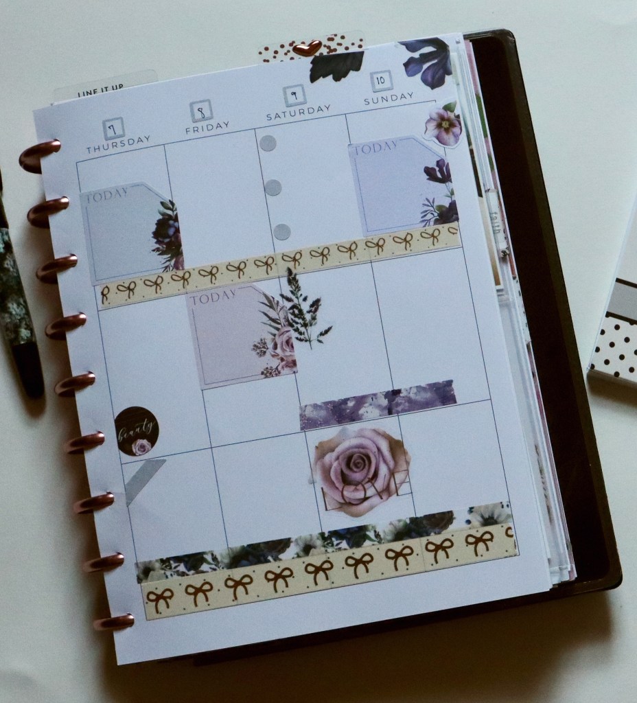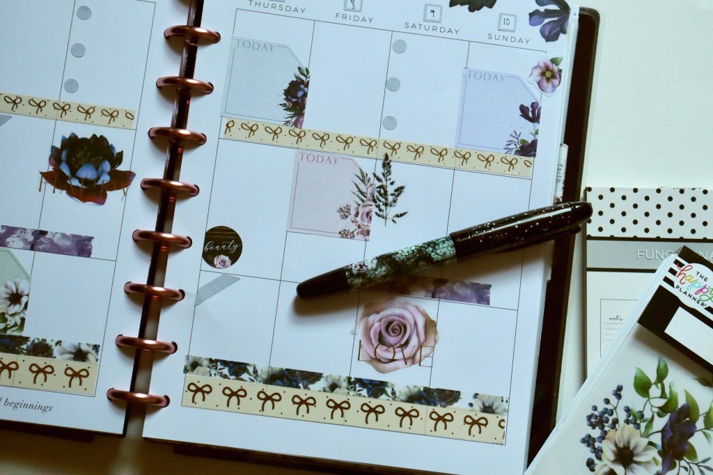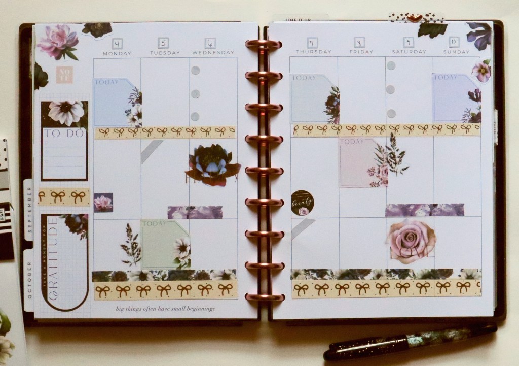I’m using the Beauty in Florals sticker book by the Happy Planner… again. ☺️ Hope y’all don’t mind. I love the deep, rich colors of the florals in the sticker book. Perfect for October. I like how all the different colors and tones work together here. I added some Simply Gilded (click for $5 off) and The Planner Society washi to round out my spread. All other stickers are by Fancy Plans.
