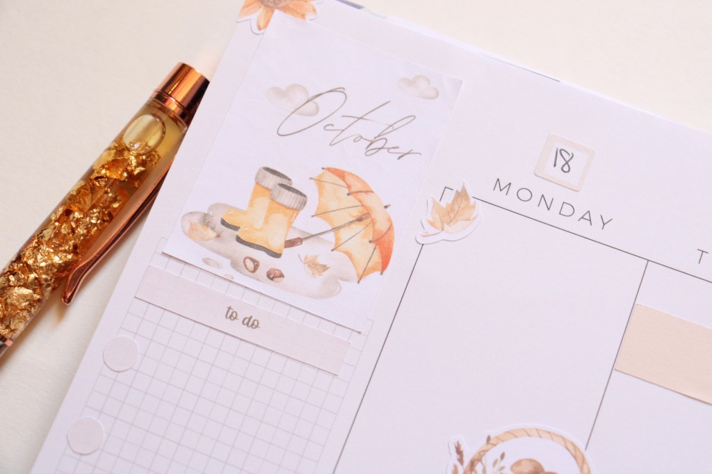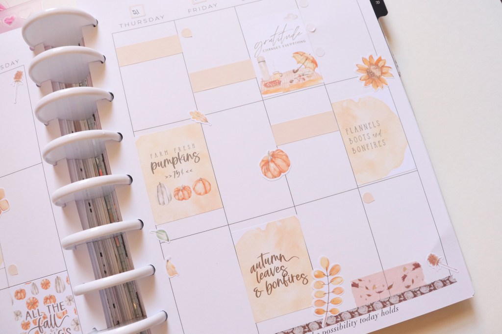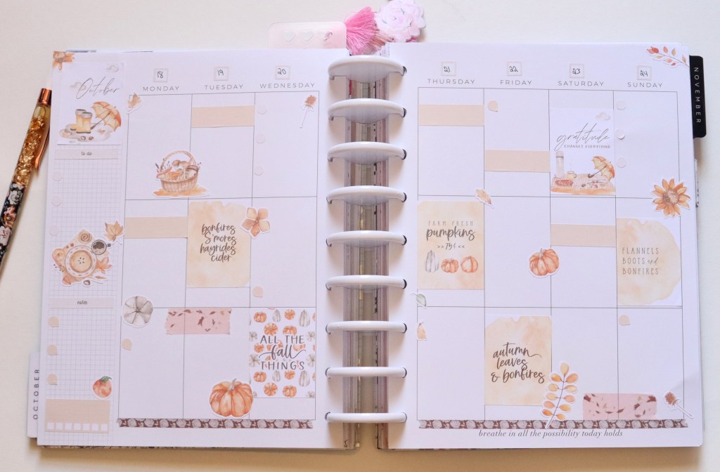 I have a pretty planner spread to share this week! I used a sticker kit (All the Fall Things) from Love, Charmaine. I figured I’d better use it before October was over, because it’s all about October. 😅 I’m not a huge fan of the bright oranges of the season- unless they’re on trees- but I love these soft orange tones here. I love how this spread turned out! Also, you might notice my discs are different. I recently bought some from JoAnn- these are the Park Lane brand– and I love how they pair perfectly with everything! Another update on my planner changes coming later this week. ☺️