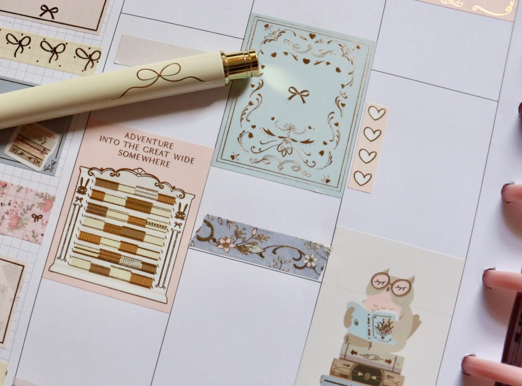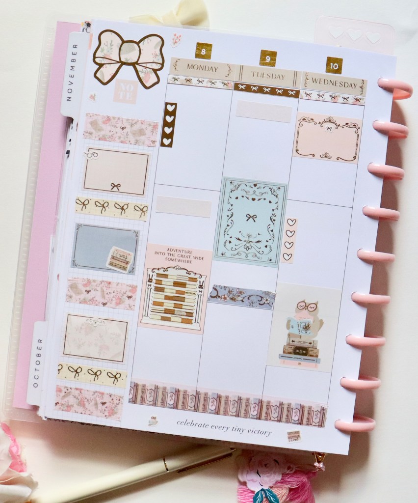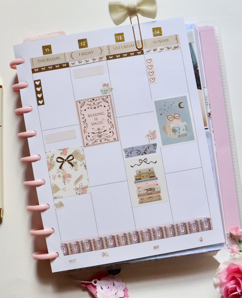 I love, love, love this week’s spread. I used the recent Simply Gilded Luminous Library box. It gives me Beauty & the Beast vibes, and since it happens to be the 30th anniversary of that beloved movie, what better way to honor it and sweet childhood memories than to put it in my planner? I love this Simply Gilded kit so much. The book washi, the Parisian feel, yep, I love it. 💙