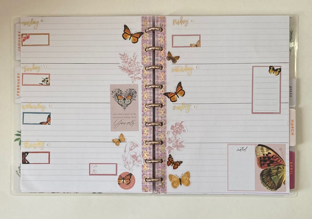 These are the first two weeks of February in my Classic Happy Planner. The first spread is all about the butterflies, although it’s clearly not butterfly season in the midwest, haha.