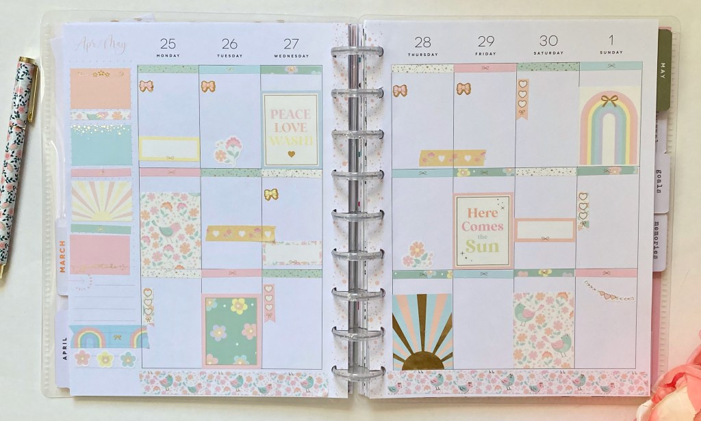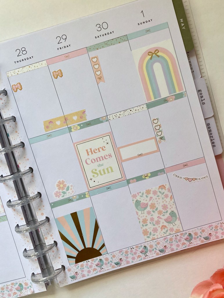 I’m here to share this week’s planner spread- which is all from Simply Gilded. More specifically, the Here Comes the Sun box. These patterns and colors remind me of Lucky Charms, the cereal. 😅 So full of spring and sunshine. 🌞 I love this spread, and I can’t wait to look at it every day this week!