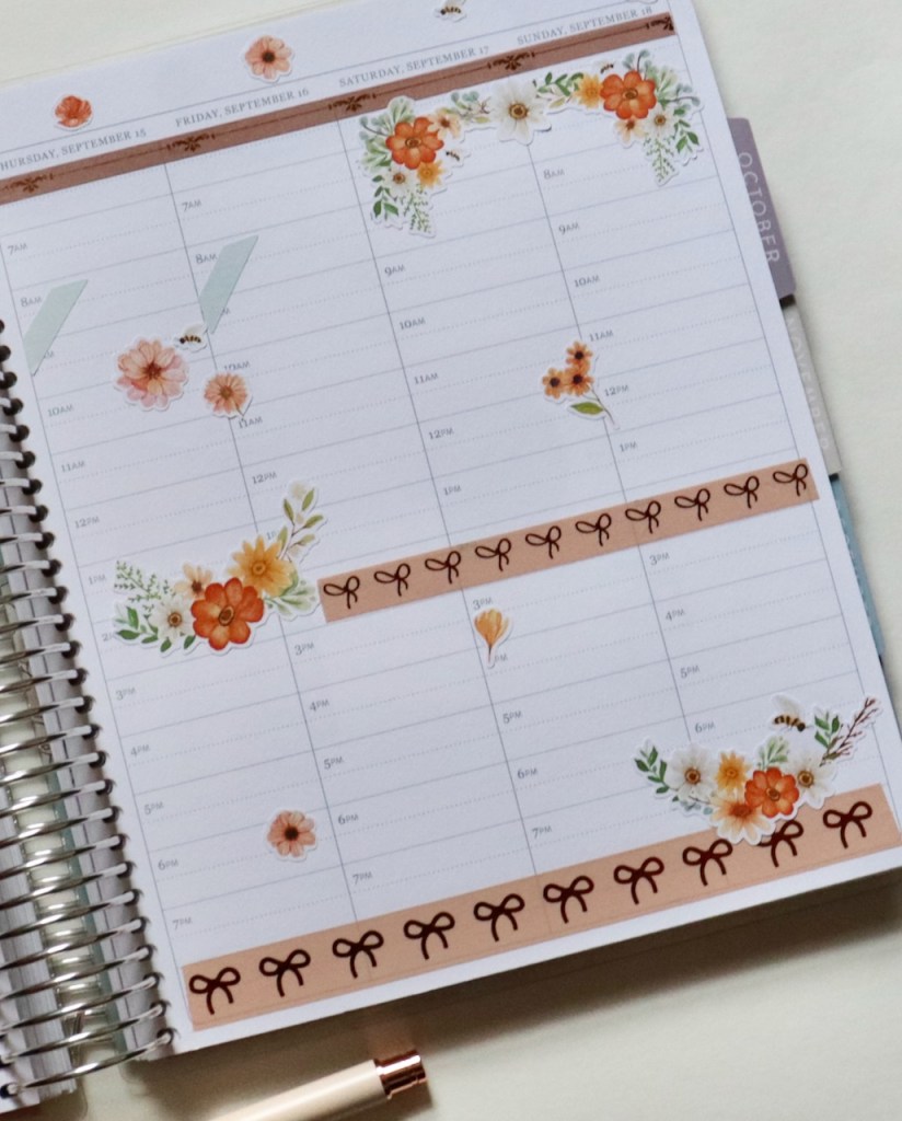 Hope you’re enjoying September so far. It hasn’t been too hot here, just rainy. I’m still getting in the fall spirit, so I thought these pretty stickers from Love, Charmaine would be perfect for this time of the year. The flowers are a pretty orange, red, yellow and peach and are so delicate. Washi is by Simply Gilded.