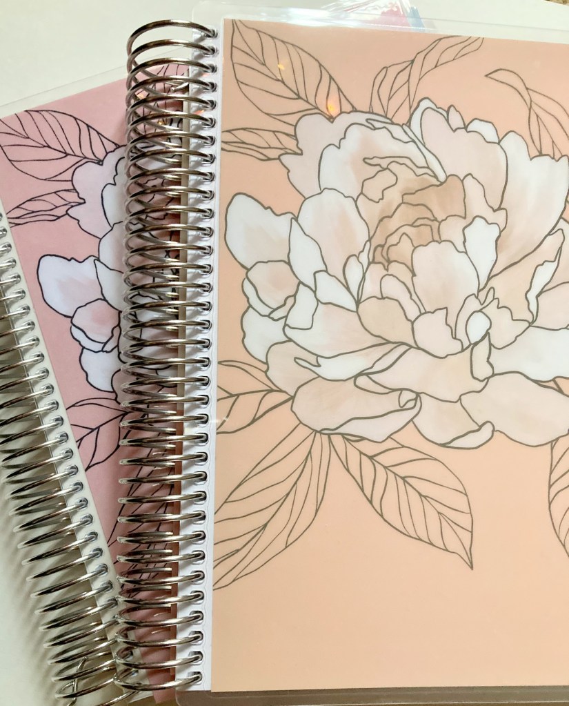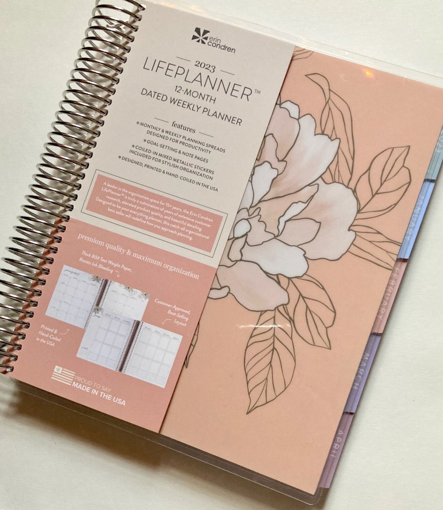 The next day, I was at Target (of course I was), and I walked down the planner/stationery aisle for fun. There it was- a beautiful Erin Condren spiral planner, just like the one I’ve been using this year, with the gorgeous Flora cover like mine (slightly different- see photo below). I like a few of the newer planners EC has released this year, but nothing like Flora. It’s a dated 2023 planner, just 12 months, vertical layout, mostly neutral spreads (except for the flower details), and it was mine.
