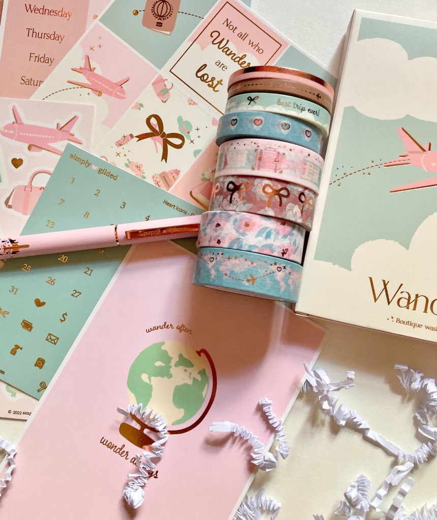 Wanderlust is the theme. It’s full of pretty travel and rose gold details. Some of it is travel specific, but it’s got enough florals and bows and such to be able to use it anytime, which I like.
